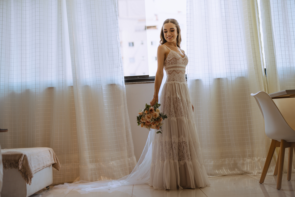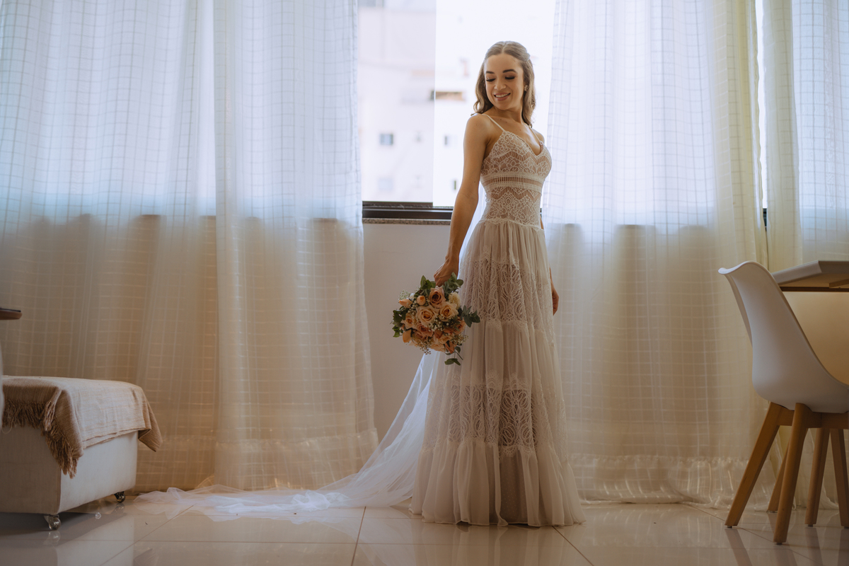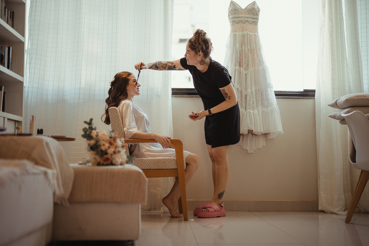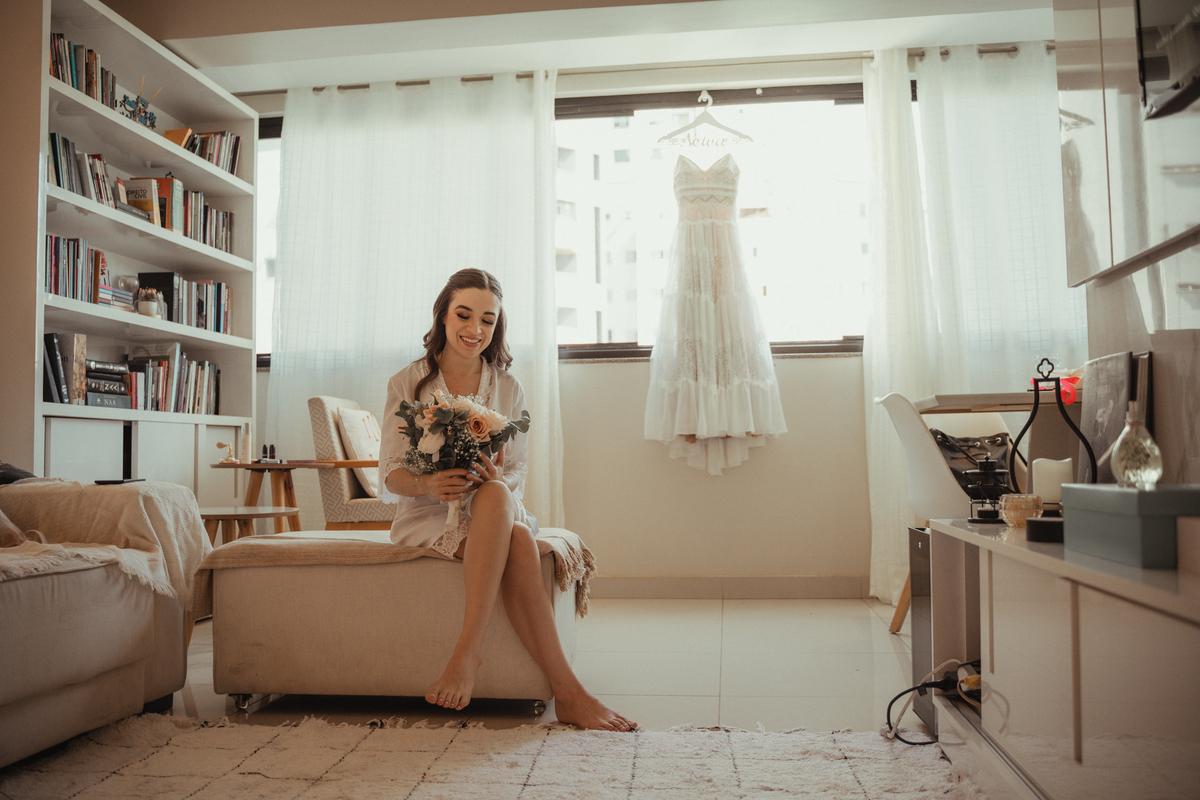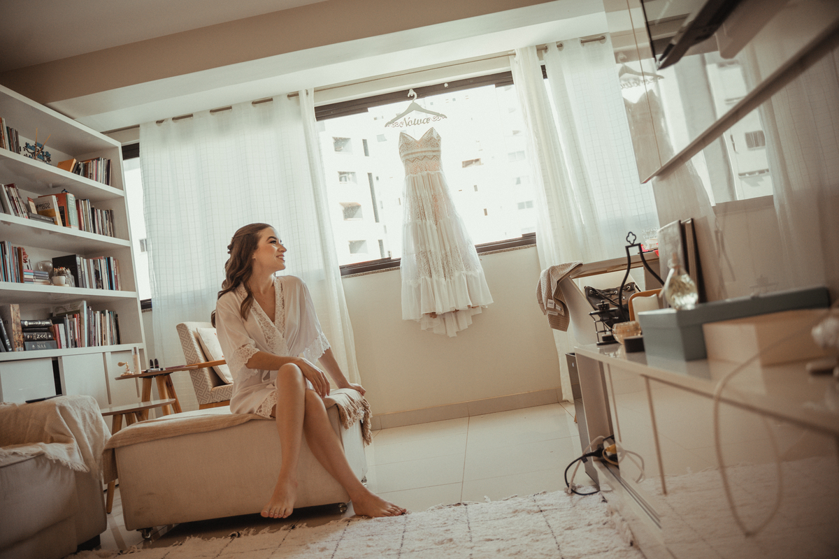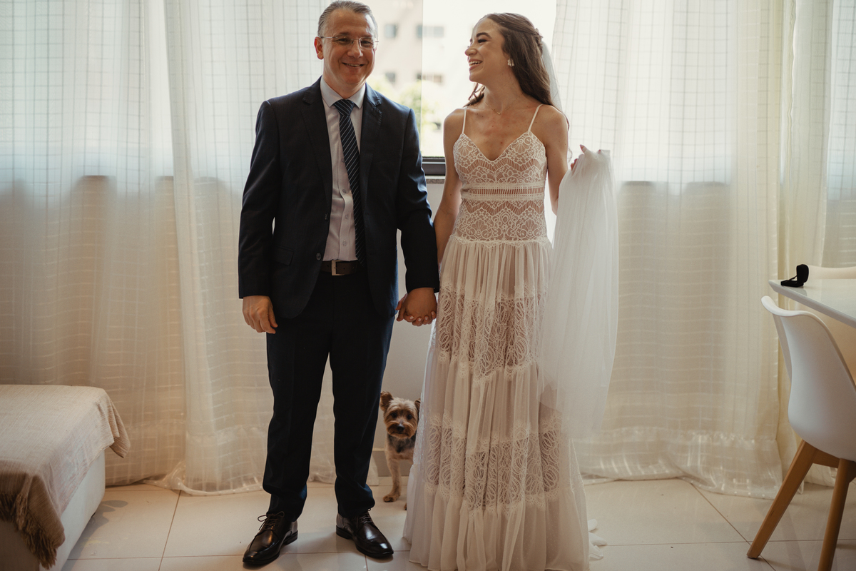 A Letícia escolheu se arrumar e passar seus últimos momentos de solteira, na casa dos seus pais, para onde depois desse dia, ela só voltaria sendo uma filha casada. É uma forma de registrar o lugar onde foi seu lar por tanto tempo sendo o cenário de um dos seus momentos mais importantes e lindos. Ela colocou na TV sua playlist de louvores bem baixinho, com sua mãe e irmãs tomaram um café na mesa, as meninas que maquiaram e arrumaram seu cabelo eram suas amigas e se deslocaram do salão até a casa dela... enquanto todas se arrumavam, o pai ficou no quarto escondidinho, logo que a Lê ficou pronta, eles fizeram um first look de pai e filha, as meninas todas choraram, claro! E teve participação de mais um membro da família, um de 4 patas kkk