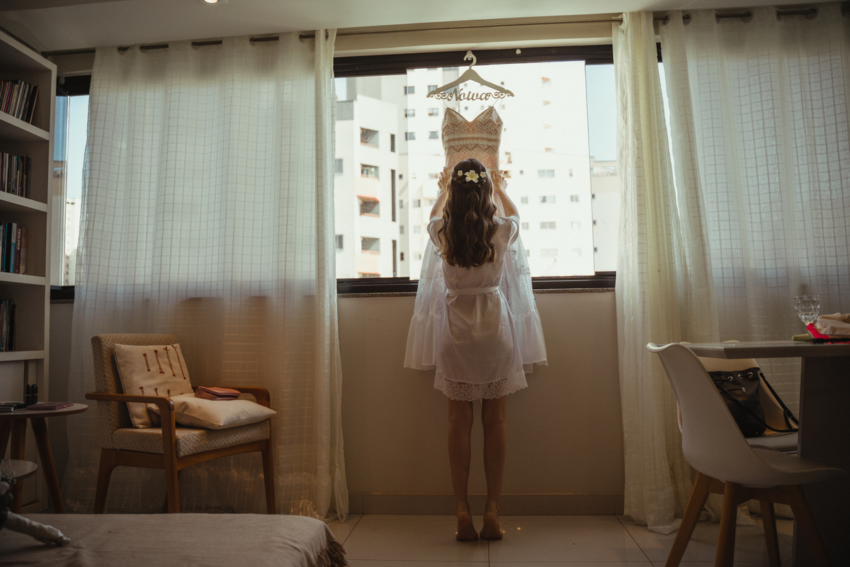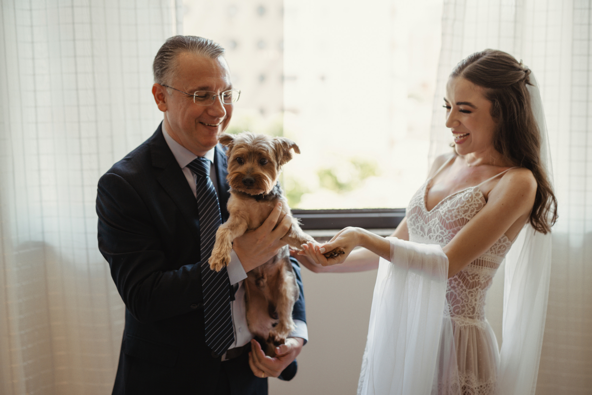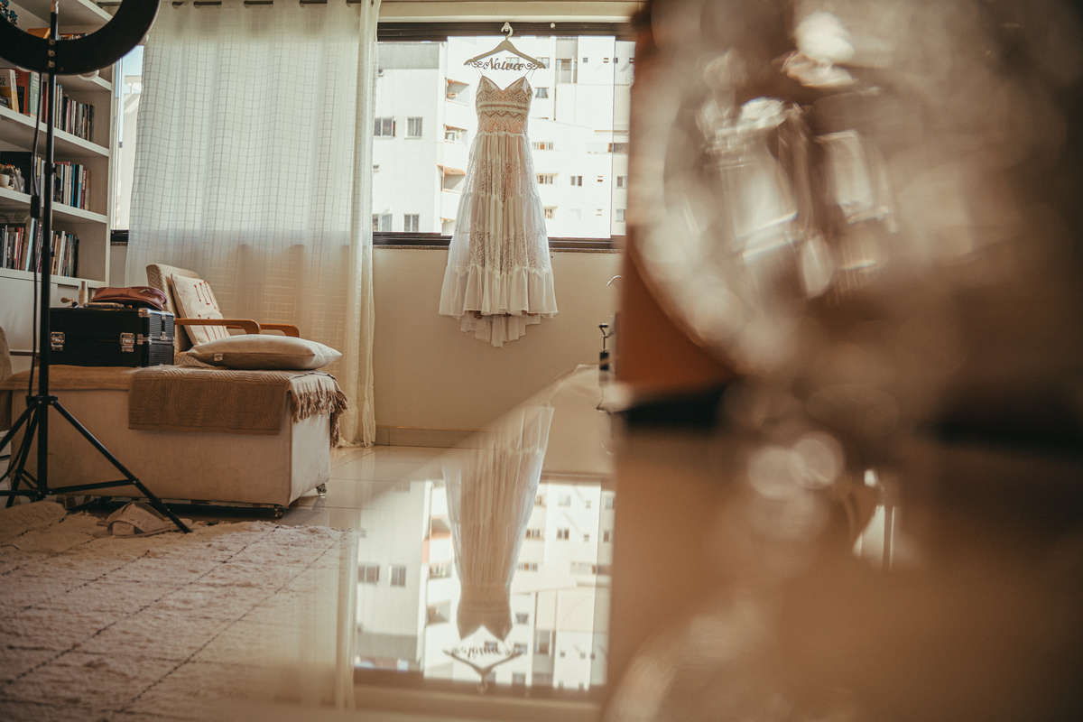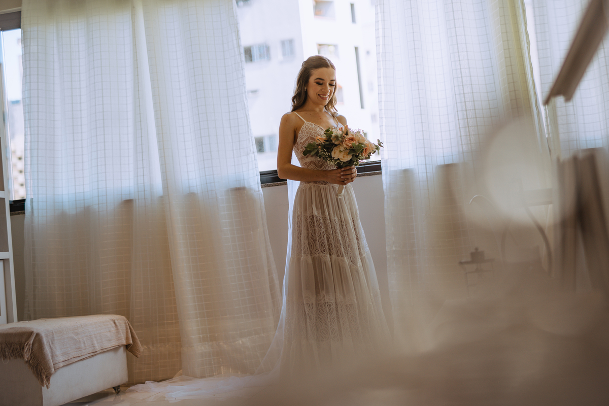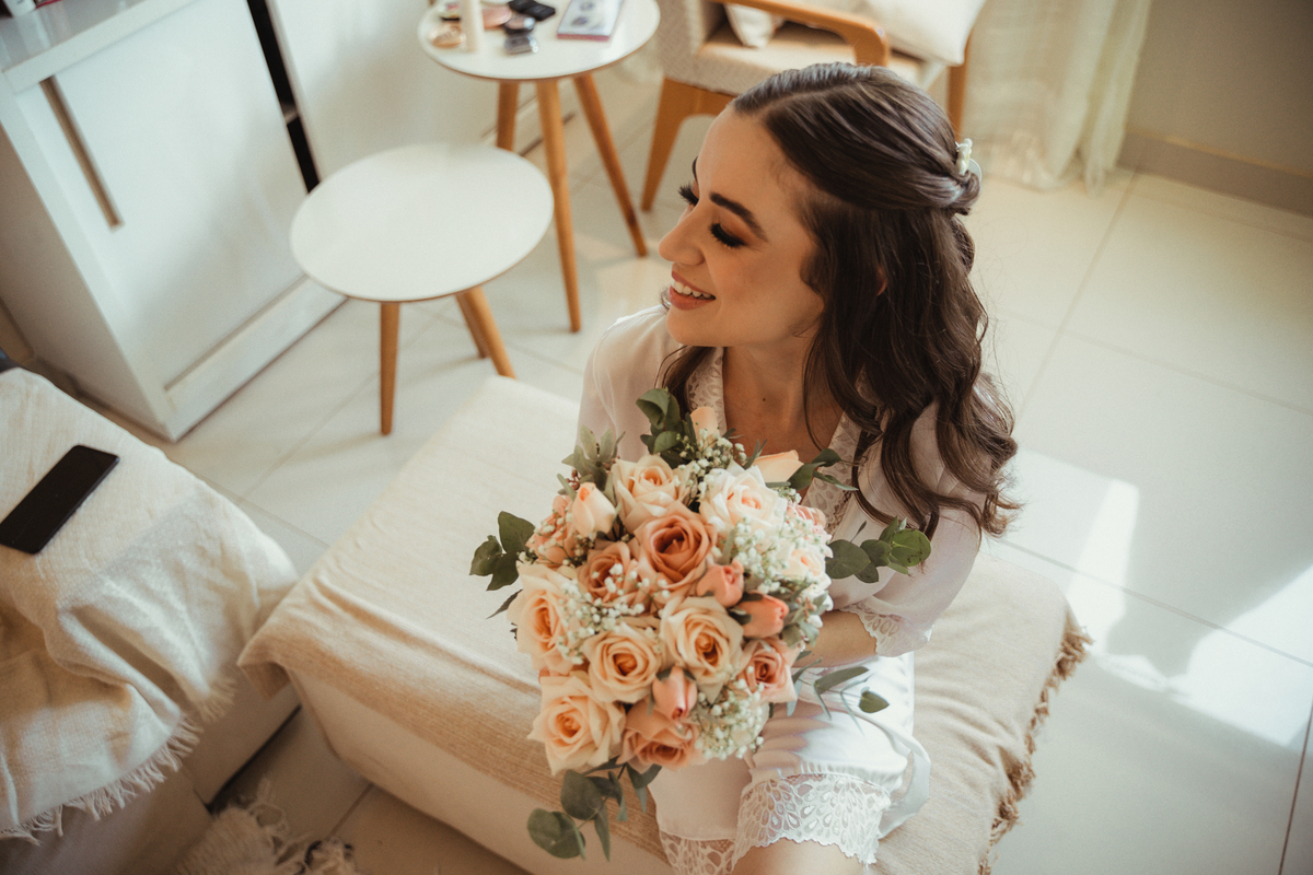 A Letícia escolheu se arrumar e passar seus últimos momentos de solteira, na casa dos seus pais, para onde depois desse dia, ela só voltaria sendo uma filha casada. É uma forma de registrar o lugar onde foi seu lar por tanto tempo sendo o cenário de um dos seus momentos mais importantes e lindos. Ela colocou na TV sua playlist de louvores bem baixinho, com sua mãe e irmãs tomaram um café na mesa, as meninas que maquiaram e arrumaram seu cabelo eram suas amigas e se deslocaram do salão até a casa dela... enquanto todas se arrumavam, o pai ficou no quarto escondidinho, logo que a Lê ficou pronta, eles fizeram um first look de pai e filha, as meninas todas choraram, claro! E teve participação de mais um membro da família, um de 4 patas kkk