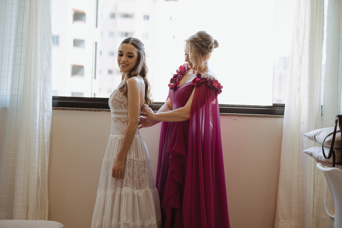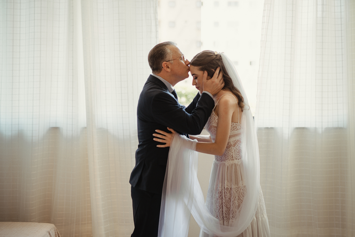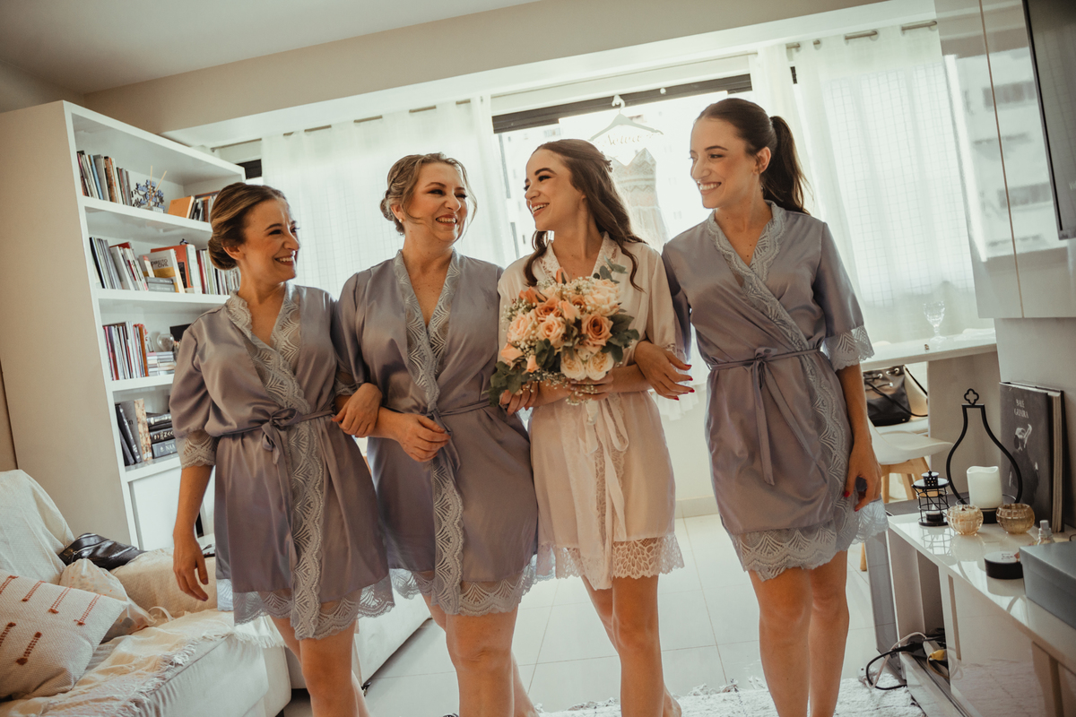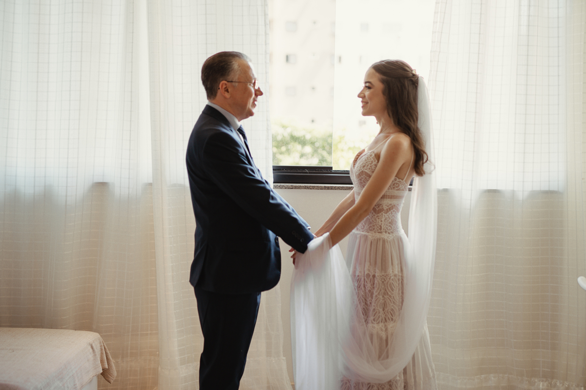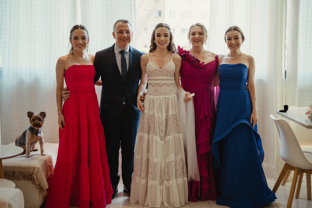 A Letícia escolheu se arrumar e passar seus últimos momentos de solteira, na casa dos seus pais, para onde depois desse dia, ela só voltaria sendo uma filha casada. É uma forma de registrar o lugar onde foi seu lar por tanto tempo sendo o cenário de um dos seus momentos mais importantes e lindos. Ela colocou na TV sua playlist de louvores bem baixinho, com sua mãe e irmãs tomaram um café na mesa, as meninas que maquiaram e arrumaram seu cabelo eram suas amigas e se deslocaram do salão até a casa dela... enquanto todas se arrumavam, o pai ficou no quarto escondidinho, logo que a Lê ficou pronta, eles fizeram um first look de pai e filha, as meninas todas choraram, claro! E teve participação de mais um membro da família, um de 4 patas kkk
